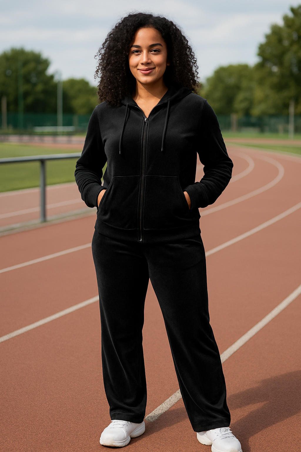 La hoodie, con capucha ajustable y cierre completo, aporta un toque moderno y funcional, permitiéndote crear distintos estilos según la ocasión: abierta para un look casual y relajado, o cerrada para un aire más sofisticado. El pantalón, con cintura elástica y ajuste perfecto, estiliza las piernas y realza tus curvas con naturalidad, convirtiéndose en una pieza versátil para tu día a día.