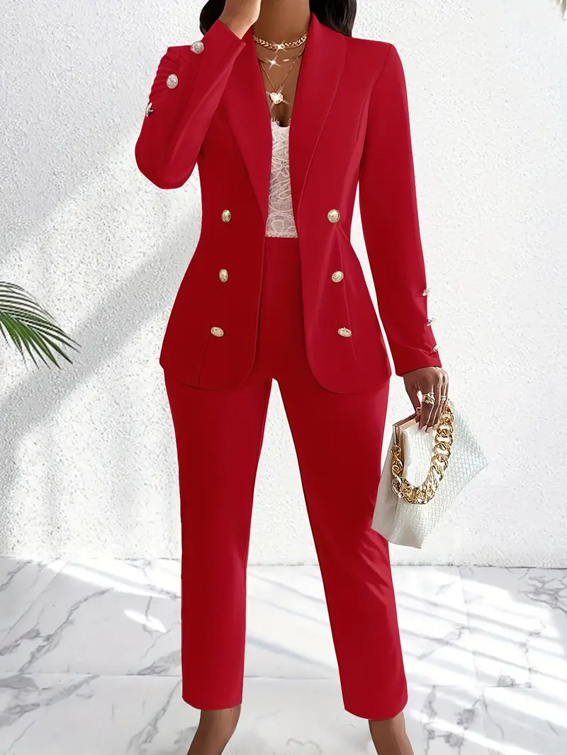 Diseño: El conjunto incluye un blazer de manga larga con cuello de solapa, que añade un toque clásico y elegante. El blazer presenta un detalle de botones que no solo es funcional, sino que también realza el diseño general. Los pantalones a juego son de corte recto, proporcionando un ajuste cómodo y favorecedor. El color sólido del traje permite combinarlo fácilmente con diferentes blusas y accesorios, lo que lo convierte en una opción versátil para tu armario.