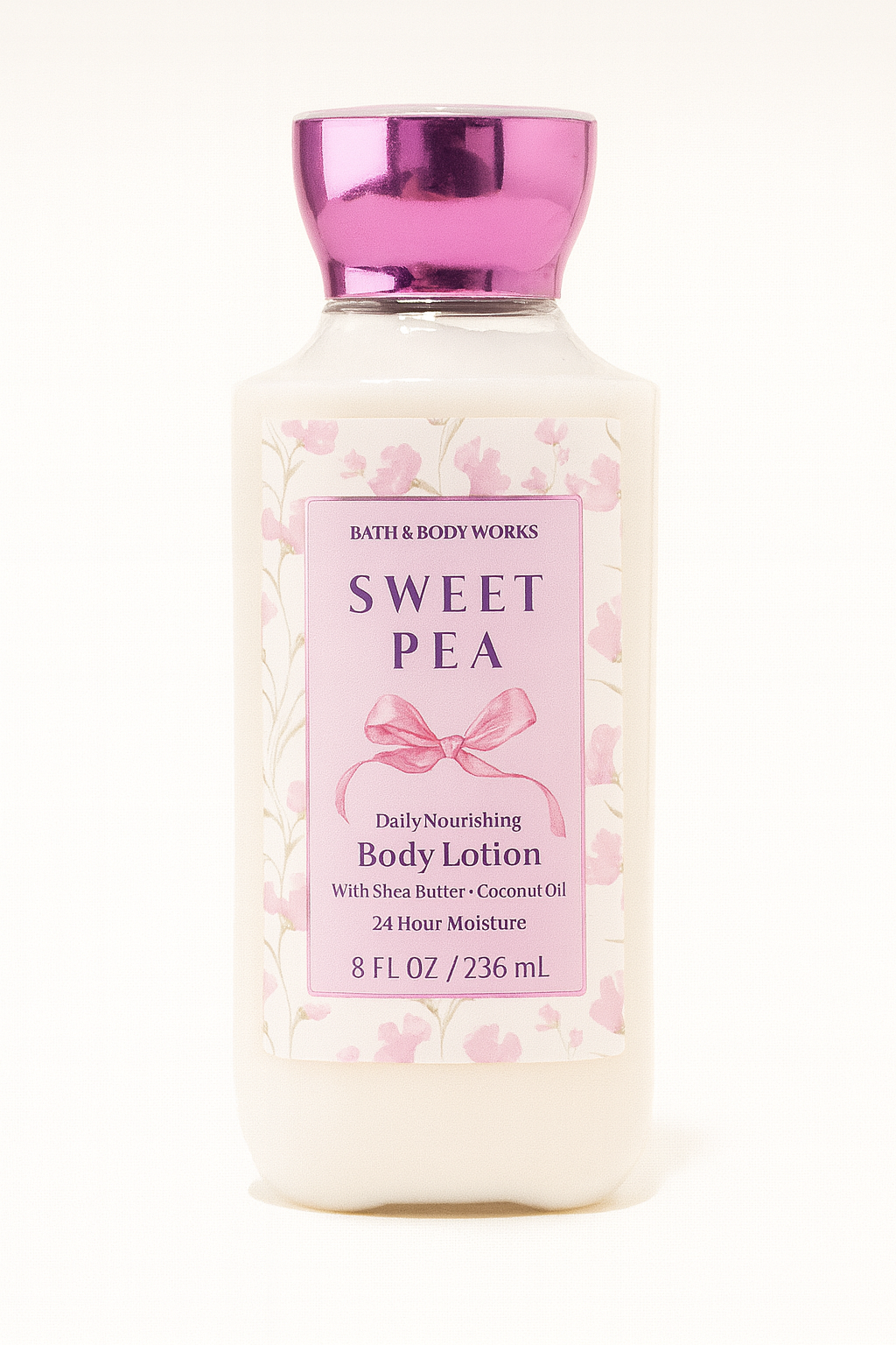 La loción corporal Sweet Pea de Bath & Body Works es un clásico favorito por su fragancia floral, delicada y femenina. Enriquecida con manteca de karité y aceite de coco, proporciona 24 horas de hidratación continua, dejando la piel suave, nutrida y con una textura sedosa. Su aroma combina notas de guisante dulce, peras jugosas, frambuesa y pétalos de rosa, creando una fragancia romántica, fresca y encantadora. Su fórmula ligera se absorbe fácilmente sin dejar sensación grasosa, perfecta para el cuidado diario. Ideal para quienes disfrutan aromas dulces y florales que evocan frescura y ternura en cada aplicación.