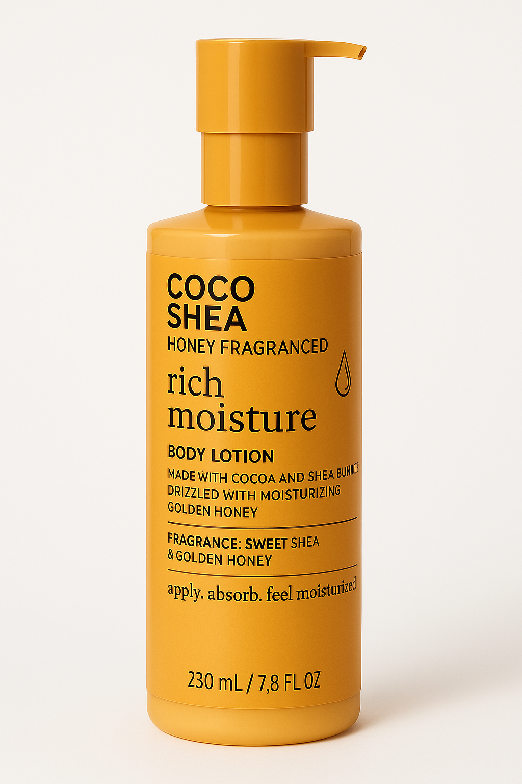 La loción corporal Coco Shea Honey Fragranced – Rich Moisture combina la riqueza natural del cacao y la manteca de karité con el toque dulce y reconfortante de la miel dorada, creando una experiencia de hidratación profunda y sensorial. Su fórmula cremosa nutre la piel seca, aportando suavidad y un brillo saludable que se mantiene durante todo el día. Ideal para quienes buscan una piel tersa, flexible y con un aroma cálido y envolvente. Su textura se absorbe rápidamente sin dejar residuos grasos, mientras que su fragancia combina notas de miel, manteca dulce y un delicado fondo amaderado, perfecta para cualquier ocasión.